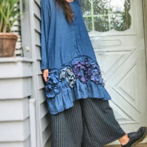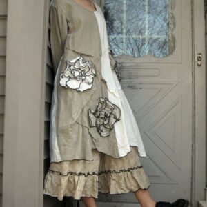 Women’s Retro Cotton and Linen Color Matching Ruffled Flower Applique Long Sleeve Dress